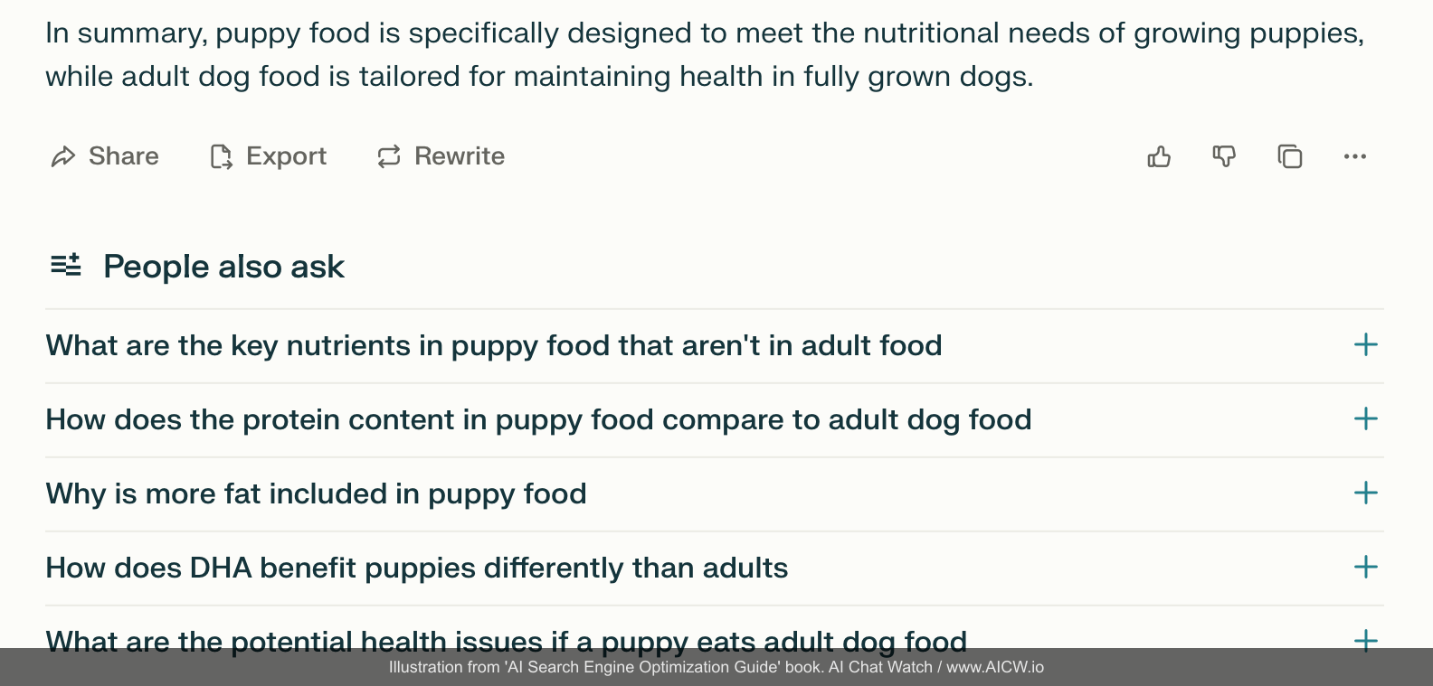 “why puppy food is different from adult dog food”: This is particularly insightful. The AI doesn’t just want to know what the differences are, but why they exist. It generates a new question exploring the underlying reasons and rationale behind the formulation differences.