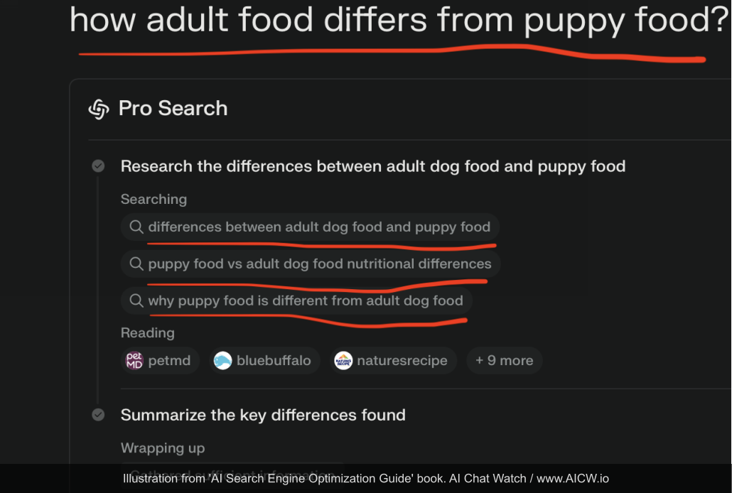Instead of just searching for that exact phrase, the AI’s pre-processing step rewrites the query as “Research the difference between adult dog food and puppy food” and then intelligently breaks it down into three distinct, more targeted web searches: