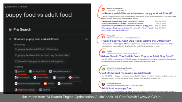 On this step, AI summarizes search results and generates a final answer with links to sources, often prioritizing more authoritative sources. AI summarization mirrors human behavior: if searching for information on puppy food, you might trust and check a few well-known veterinary sites and major brand websites first, rather than clicking through dozens of search results! At the same time the summarization also depends on the specific LLM model because every model is trained on different datasets (more about it later). Final response to a user is the summary with inline clickable references to source websites:
