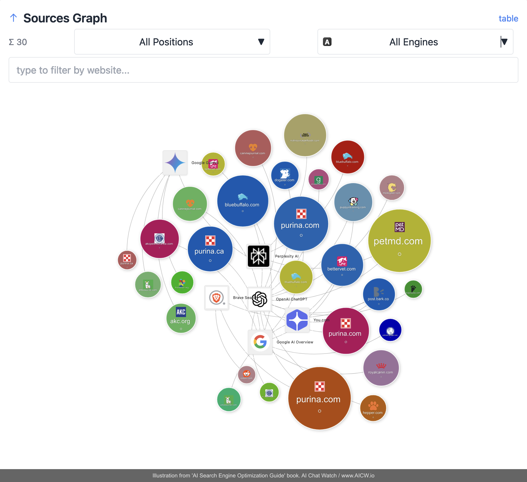 Figure 3.5. Source analysis tool displaying the overlap and relationship between sources used by different AI engines (Graph View).