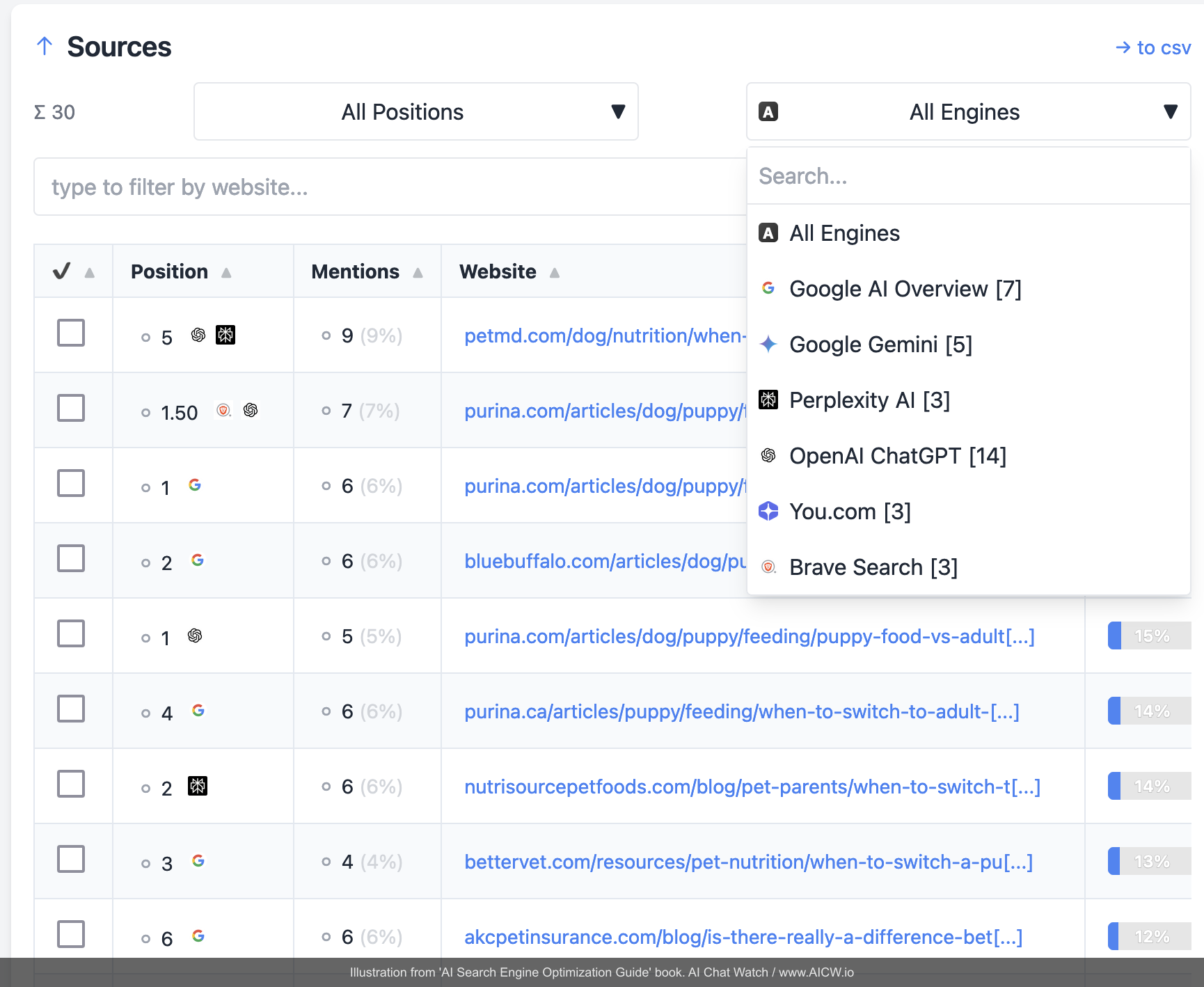 Figure 3.4. Source analysis tool displaying website mentions and rankings across multiple AI search engines (List View).